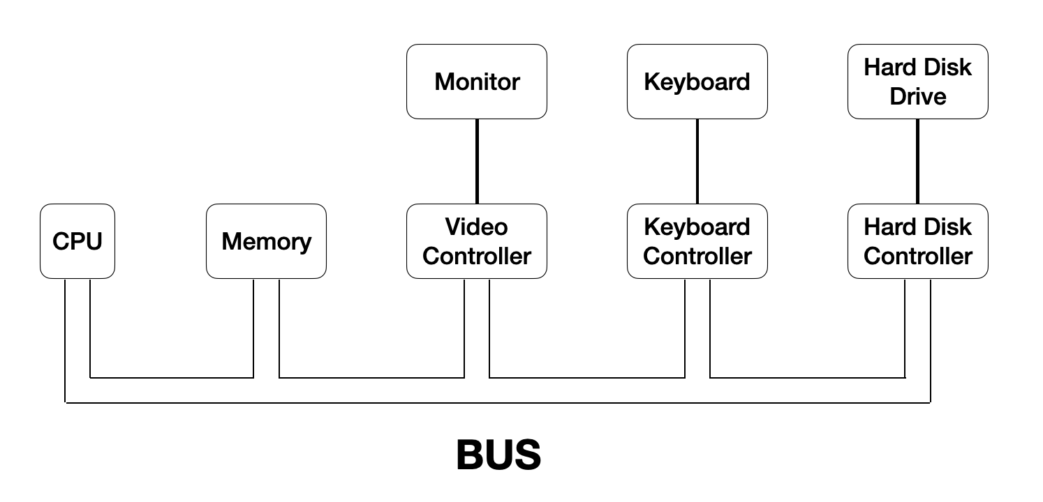 早期计算机 CPU、内存和 I/O 设备等都是直接连接在总线(BUS)上。
