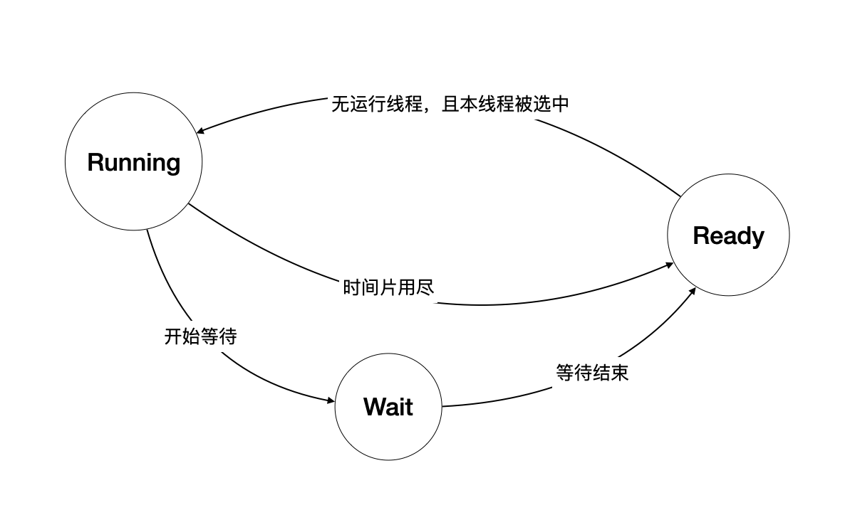 处于运行中线程有一段可以执行的时间,叫做时间片,当时间片用尽时候,线程将处于就绪状态。 如何时间片用尽之前,开始等待某事件,线程将进入等待状态,等待状态的线程,事件发生后也将进入就绪状态。 当一个线程离开运行中状态后,调度系统会选择一个就绪中状态的线程进行执行。