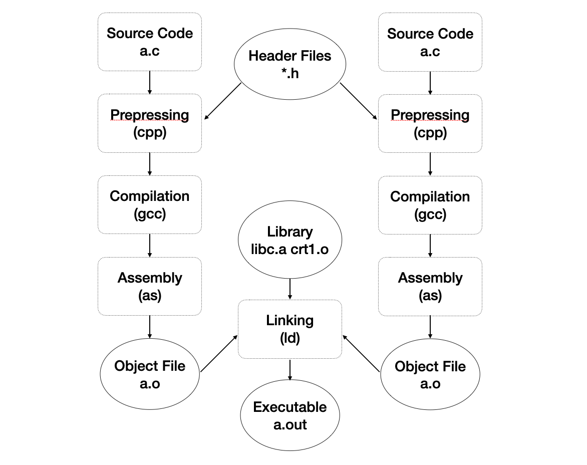 源代码到可执行文件的生成可分为预处理(Prepressing)、编译(Compilation)、汇编(Assembly)和链接(Linking),四个步骤。